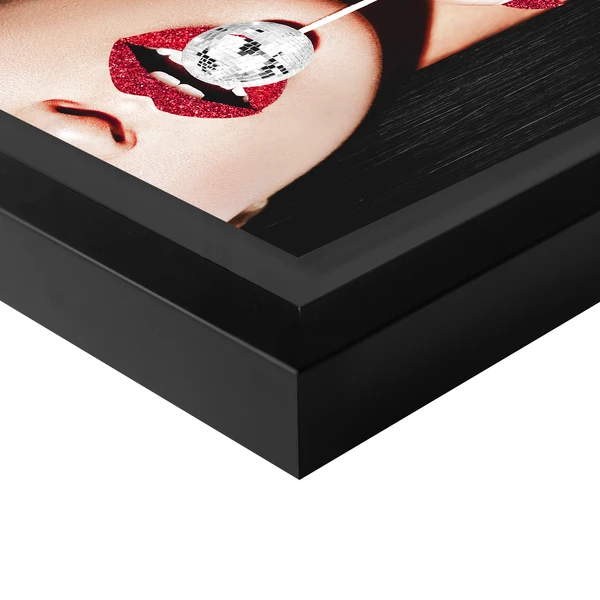 - Pedestal-mounted art print set off against a black mat, embellished with red glitter detailing.