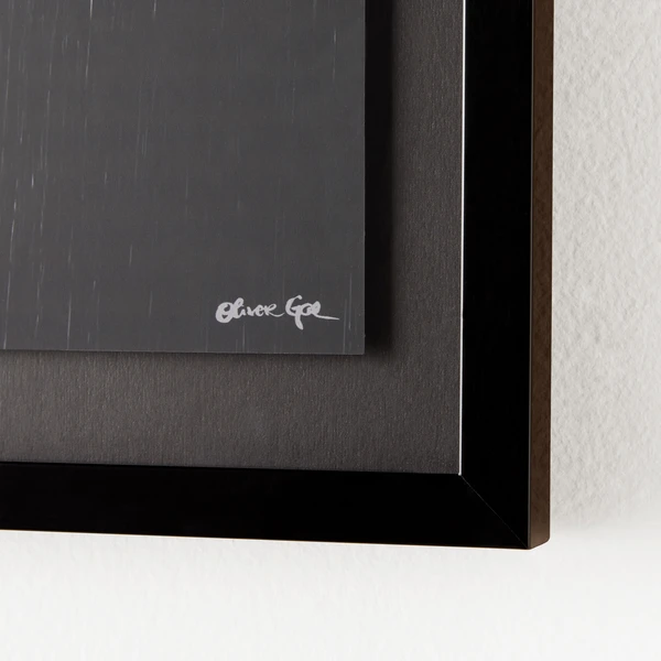 - Mounted within a high gloss black wood shadowbox frame and set under plexiglass.