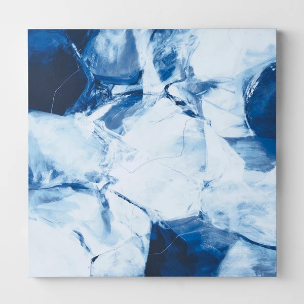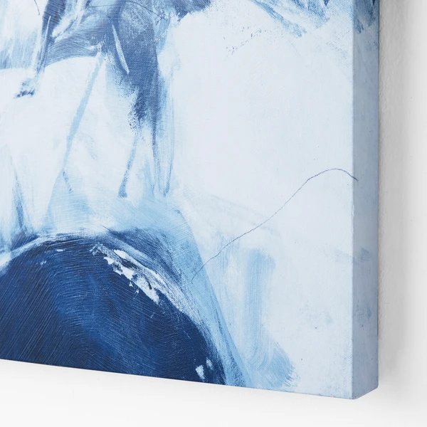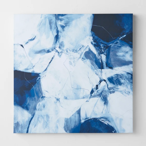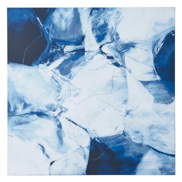Shades of blue are celebrated in the series entitled Light Taming. These dynamic abstract pieces are perfectly square and engage the eye in a remarkable way. Created with giclee on canvas, each piece has an image brush gel finish. Hand-painted strokes of the original image are applied with a brush. 1 of 2 in a series.