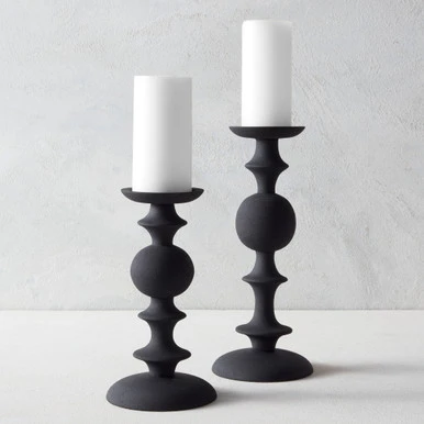 Designed with a shapely silhouette and textured, matte black finish, our Matias pillar holders make a stunning addition to any decor. Holds a 3.5” diameter pillar candle, not included.