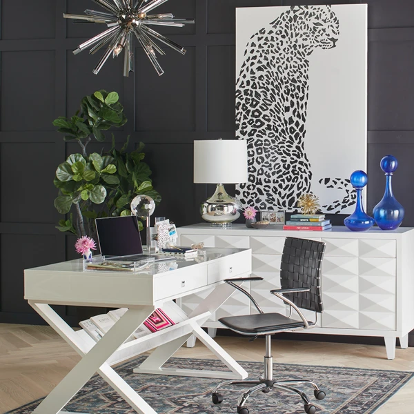 Rendered with thick, glossy black paint, the spots of the cheetah in this original work from artist Beverly Fuller pop against a white background. Painted on canvas, this piece is unframed.